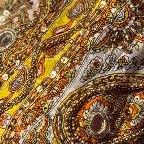 Dit korte jurkje is handgemaakt en voorzien van spiegeltjes, pailletten en kraaltjes. Steel jij de show?!