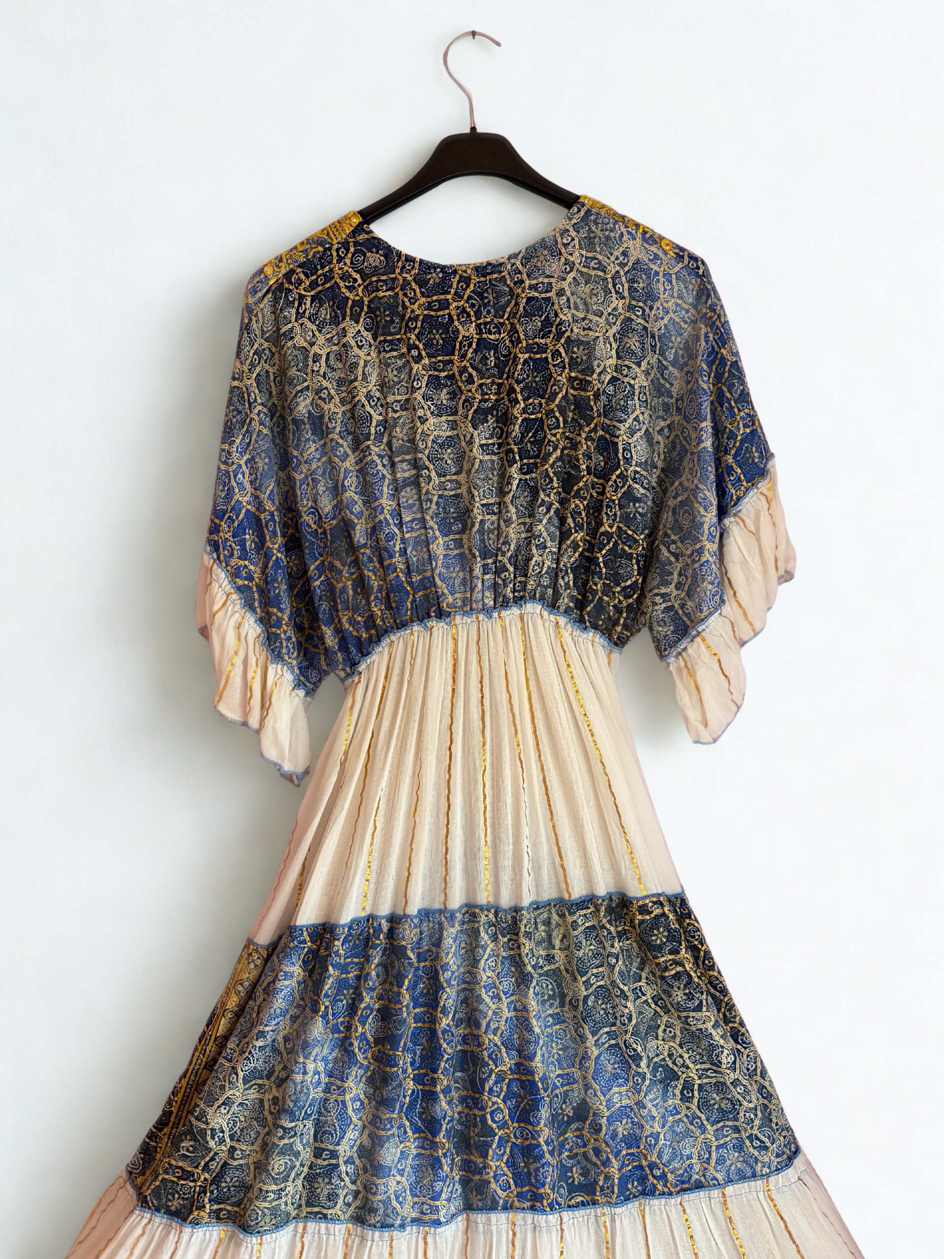 Geweldig! Deze handgemaakte jurk vol met stiksels, spiegeltjes en glitter steelt gegarandeerd de show. De jurk is elegant, chique en casual tegelijkertijd. De mooie combinatie van blauwe en gele tinten brengen je helemaal in de zomerse sferen en dat in combinatie met de zachte stof is een match made in heaven!