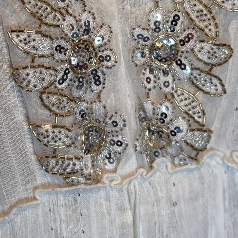 Deze mooie elegante jurk met gouden en zilveren versieringen is prachtig! De jurk is luxe afgewerkt met diverse kralen en gouden stiksels. De gehele jurk bevat kleine glinsterende pailletten die jou deze zomer laten stralen.