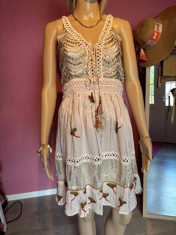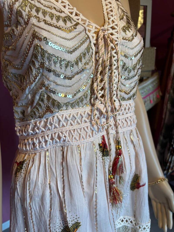 Deze mooie korte jurk met diverse versieringen is prachtig! De jurk is luxe afgewerkt met diverse kralen en gouden stiksels. De gehele jurk bevat diverse versieringen. De jurk is verkrijgbaar in de kleuren zwart en roze.