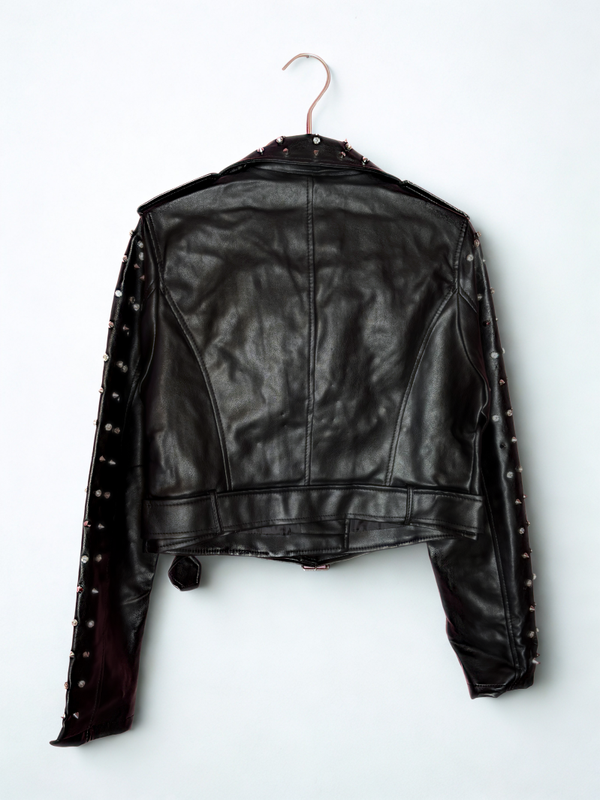 Dit zwarte korte jasje van imitatieleer is een echte statement piece. Het klassieke biker-model met ritssluiting en riemdetail krijgt een edgy upgrade door de studs en glinsterende diamanten die over de buitenkant zijn verspreid. Stoer en stijlvol tegelijk!