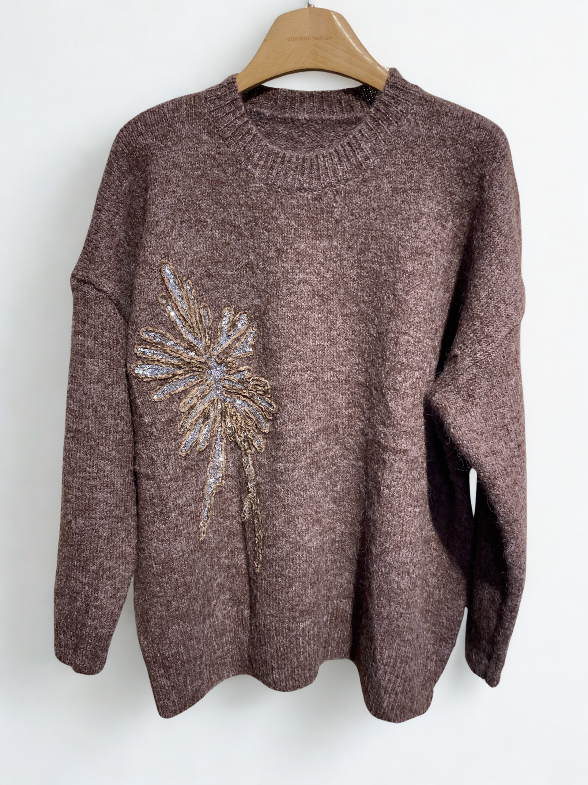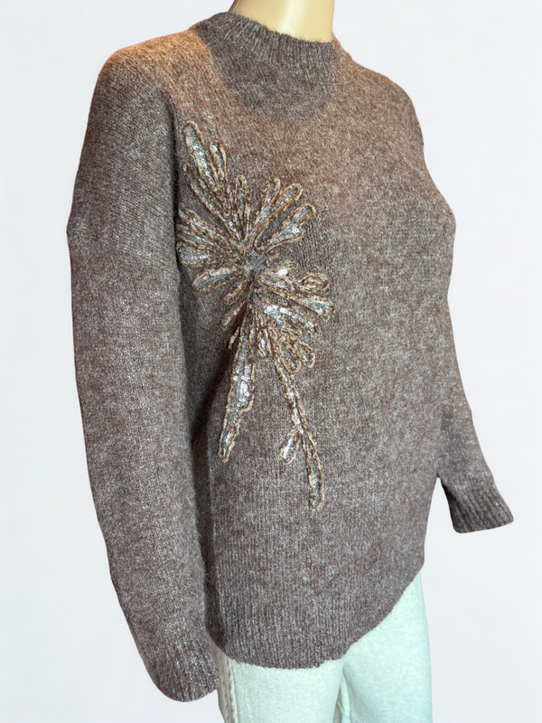 Deze heerlijke trui met zilveren pailletten bloem combineert comfort met een vleugje glamour. Gemaakt van een zachte mix met 10% wol, waardoor hij warm en cozy aanvoelt, maar toch luchtig genoeg is om elke dag te dragen.
