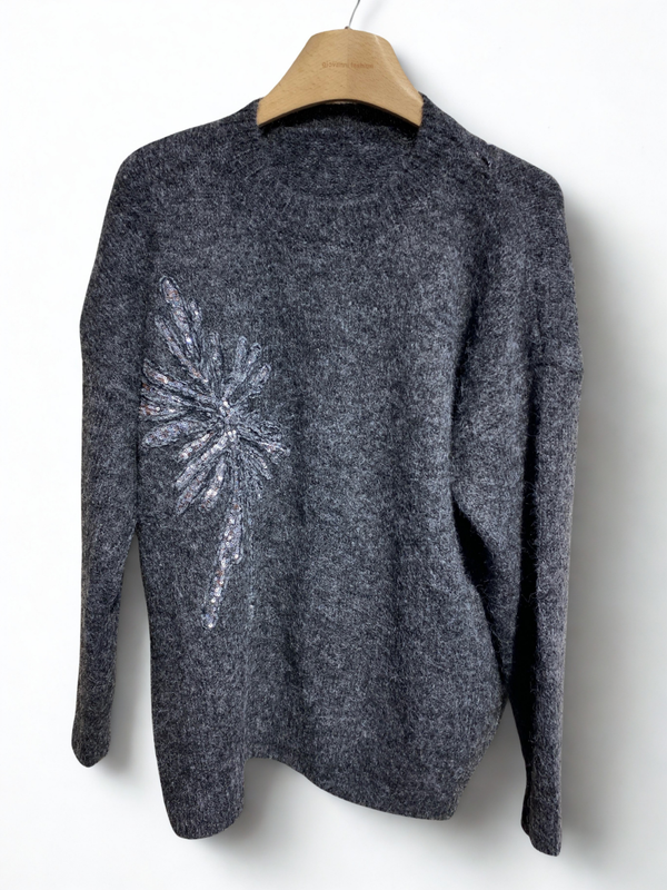 Deze heerlijke trui met zilveren pailletten bloem combineert comfort met een vleugje glamour. Gemaakt van een zachte mix met 10% wol, waardoor hij warm en cozy aanvoelt, maar toch luchtig genoeg is om elke dag te dragen.