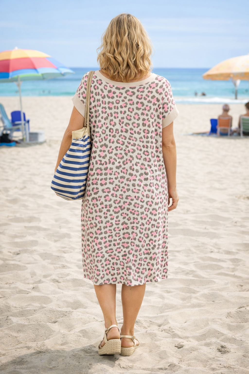 Deze panterprint jurk voor dames is de perfecte combinatie van comfort en stijl. De zachte peachy en roze tinten geven de klassieke leopard print een frisse, zomerse uitstraling. Ideaal voor een dagje strand, vakantie of een casual zomerse look.