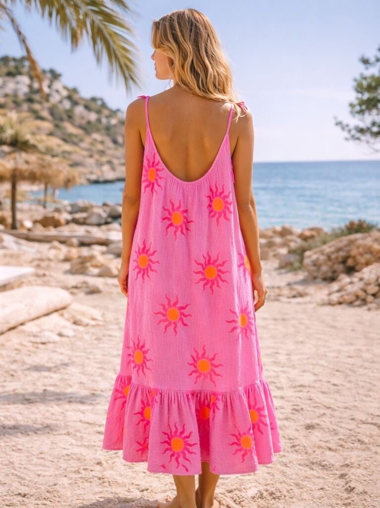 Deze roze maxi jurk voor dames is dé perfecte zomerjurk voor zonnige dagen. De opvallende zonprint in warme tinten geeft de jurk een speelse en vrolijke uitstraling. Ideaal voor vakantie, strand, een zomerse avond of een dagje uit.