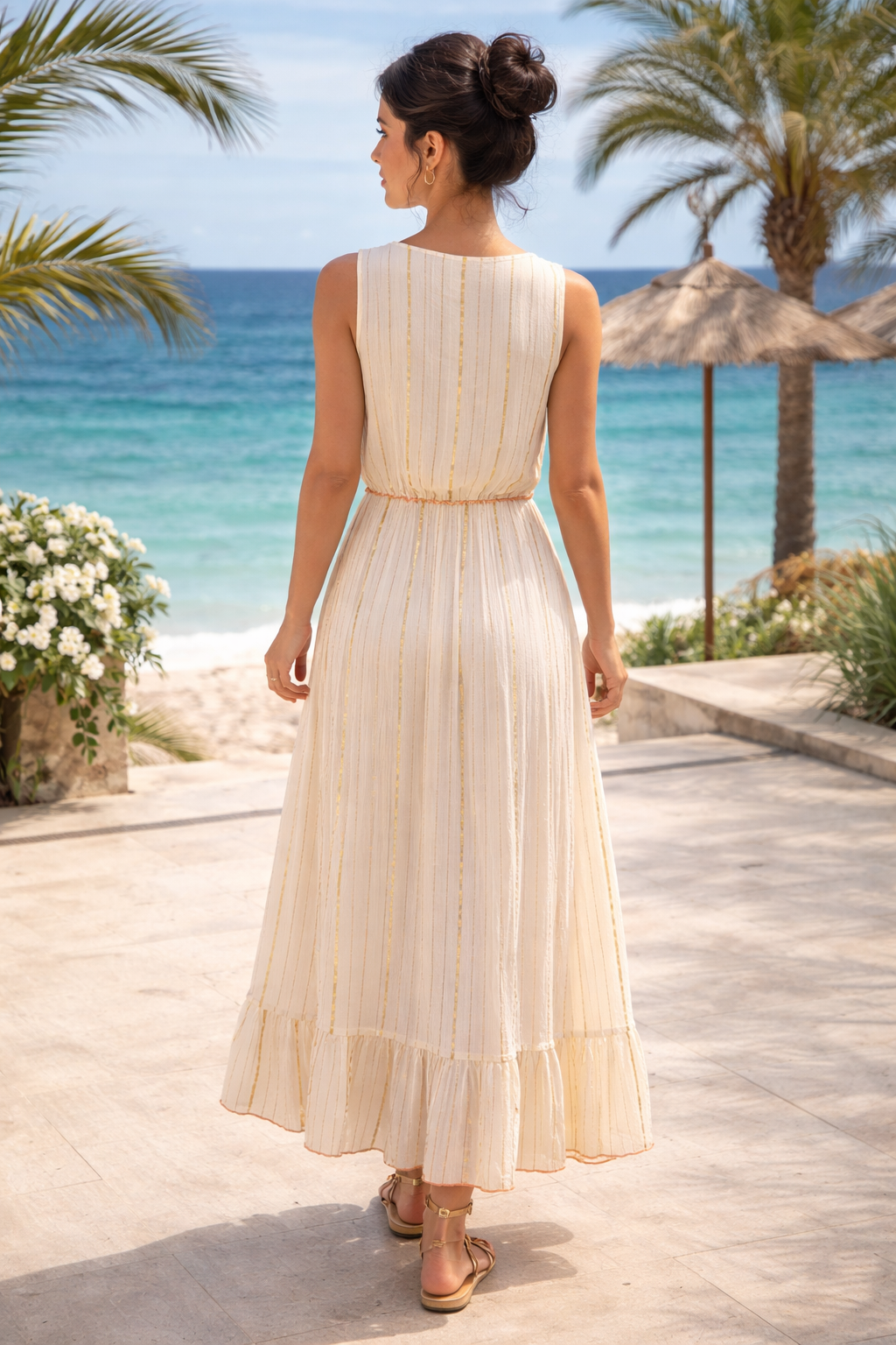 Deze maxi jurk voor dames in beige met roze borduursel straalt pure bohemian elegantie uit. De verfijnde details, vrouwelijke V-hals en subtiele gouden accenten geven de jurk een luxe en zomerse uitstraling. Perfect voor vakantie, strand, een zomerse avond of een speciale gelegenheid.